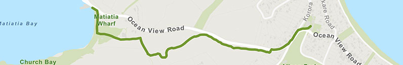 Walk along the beach, past the kayak shed until you reach a bridge across the stream. Cross the bridge, and turn left onto the low contour track, that goes along the wetland and through Te Atawhai Whenua, a Forest and Bird Reserve. Follow this low path until it exits on Ocean View Road, just before Mako Street. Cross Ocean View Road to the sidewalk on the left side of the road, and follow this, past the Library, to Oneroa village centre. Or do the walk in the other direction, starting at Oneroa Village to wander back to the Ferry Terminal.