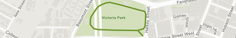 Start at the corner of Victoria Street West and Hasley Street, or anywhere along the park. Follow the flat walking path around the perimeter of the park.
