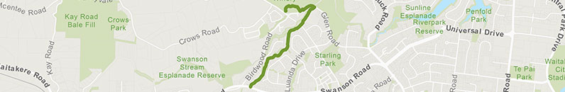 The off-road path through Waimoko / Urlich Esplanade Reserve is flat and follows the course of Swanson Stream.