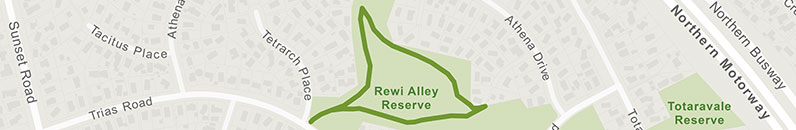 A pleasant, easy stroll around Rewi Alley Reserve in Totara Vale. The flat path also offers an ideal environment for young children learning to ride bikes and scooters.