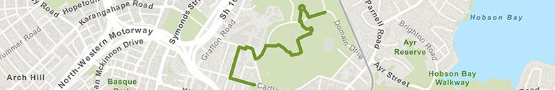 Turn right at the end of Park Avenue and head towards Pukekawa / Auckland Domain. Enter the domain through the Elliot Memorial Gates, which has a sculpture of Olympic medallist Alan Elliot by Richard Gross (1935).