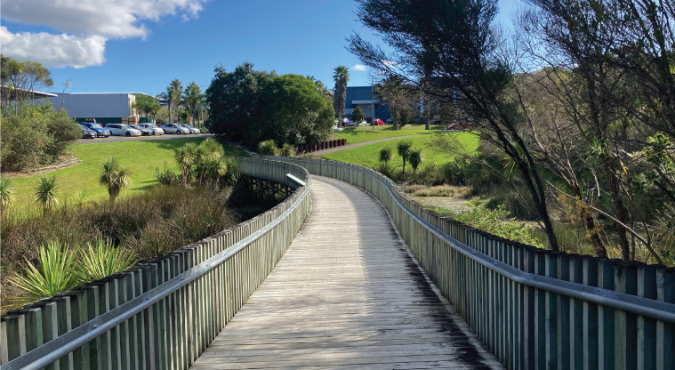 This is an easy and picturesque walk suitable for all ages and abilities. Nice wide paths and boardwalks follow the stream and pass through extensive native bush. There are lovely grass areas, a playground, a stunning basketball and games court and fitness equipment along the way. There are several great connections to this path from the surrounding areas.