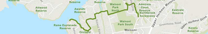 This path starts in the upper reaches of Greenhithe by Te Wharau Drive and gradually winds its way through varied scenery until you reach the Greenhithe Boat Building precinct and pontoons. En route you will enjoy the Greenhithe Pony Club, tributes to various local identities, sports fields, gardens, reserves and plenty of bush.