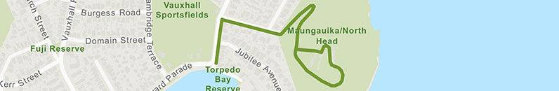 The first part of the route follows residential streets to the base of Maungauika / North Head where the easiest route is to follow the former road. There are great views over the Waitematā Harbour to the city centre, and as you head up the maunga, over Rangitoto Island and the broader Tīkapa Moana / Hauraki Gulf.