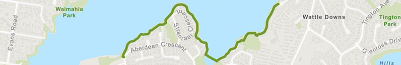 The path connects Aberdeen Crescent and Bluewater Place via the picturesque Reremoana / Wattle Downs Esplanade Reserve. The suggested starting point is at Iwinuku Crescent (off Aberdeen Crescent), where you can find a car park. You can also do the path in reverse, starting at Bluewater Place.