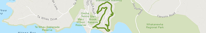 From the Hall, turn right and head up to Omiha Road. Follow the road all the way up the hill, and at the sharp turn, head left onto Upland Road. You’re on the edge of Whakanewha Regional Park here, a great place for long bush and beach walks. On this path we are staying on the roads though.