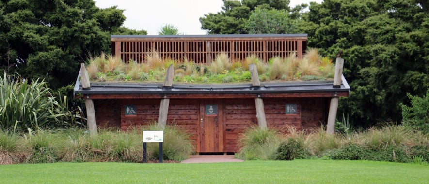 The Auckland Botanic Gardens has planted native plants on the roof of its public toilet facilities, that absorb and treat rainwater.