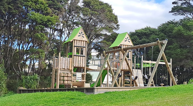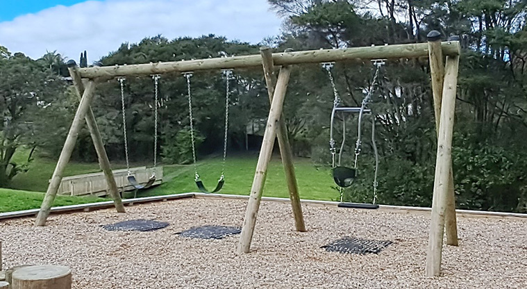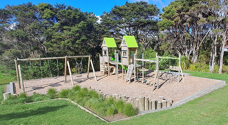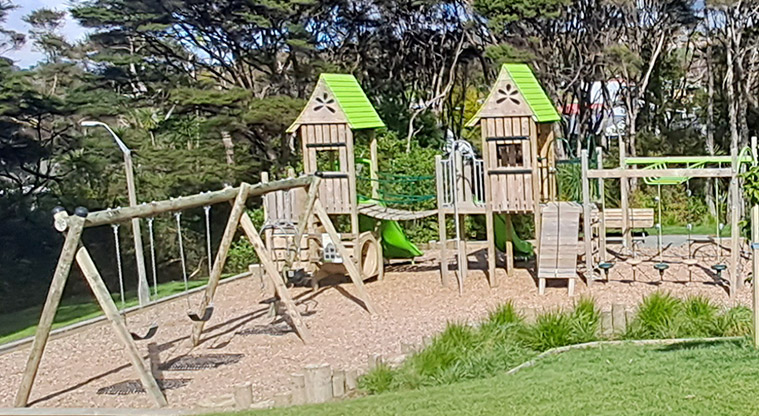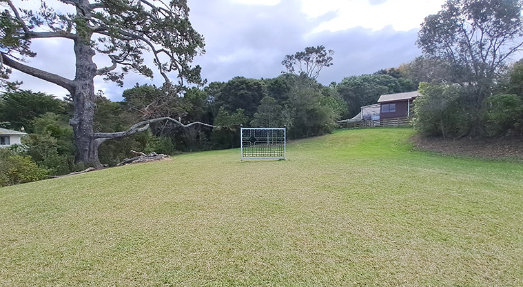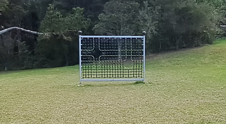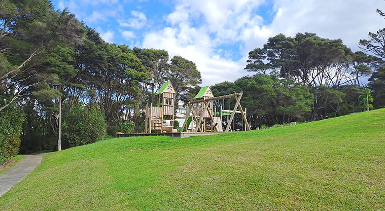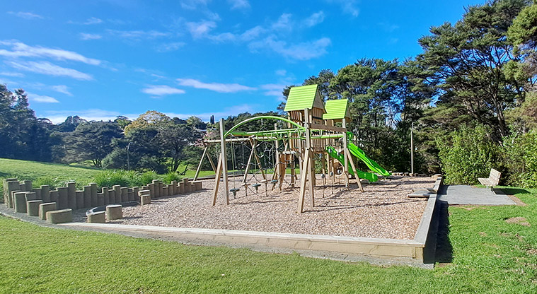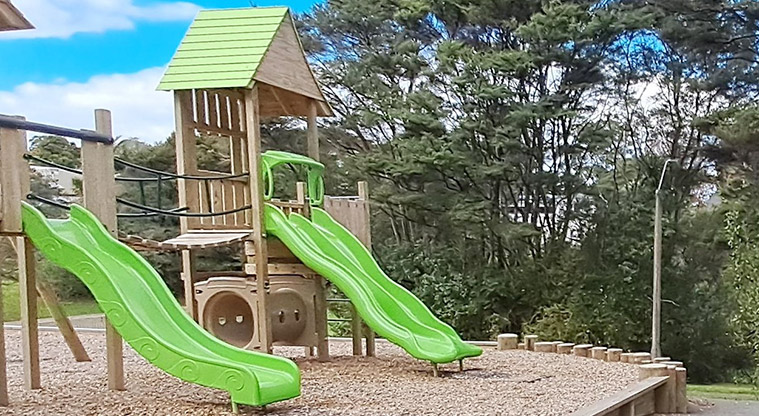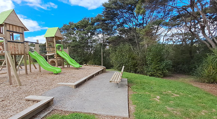 A playground, football target net and park bench are inside the reserve.