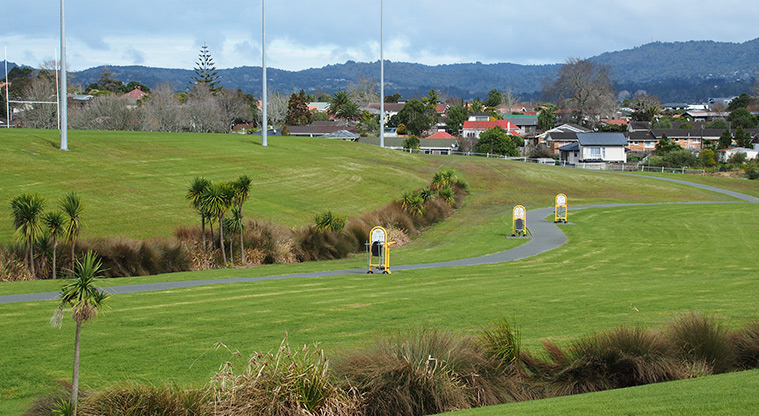 Good oncrete paths link the entrances with the mobility car parks, accessible toilets (by the car park) and other facilities. Some sections of the paths are steep. These are marked on the Te Atatū ki te Tonga / Te Atatu South Park accessible map.