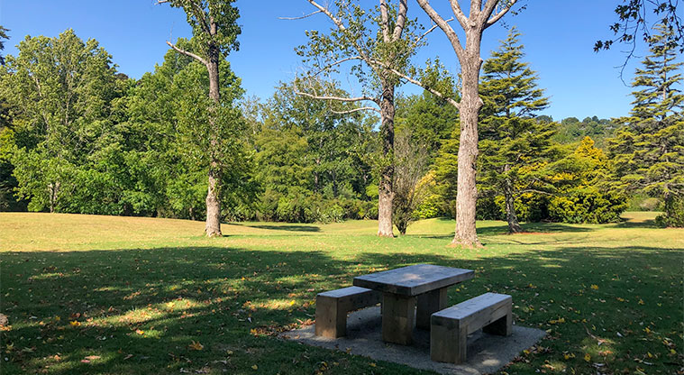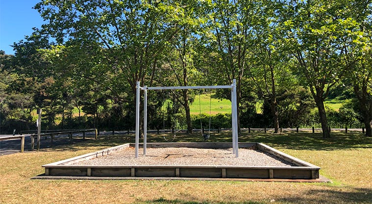 Local park with swings, mature trees and picnic tables.