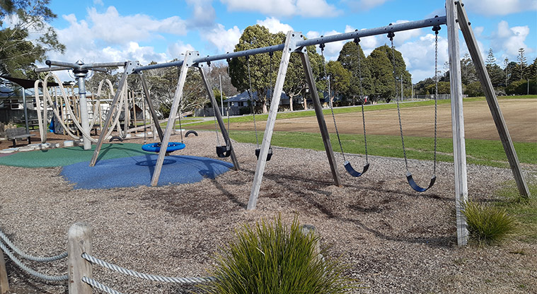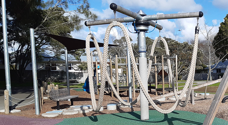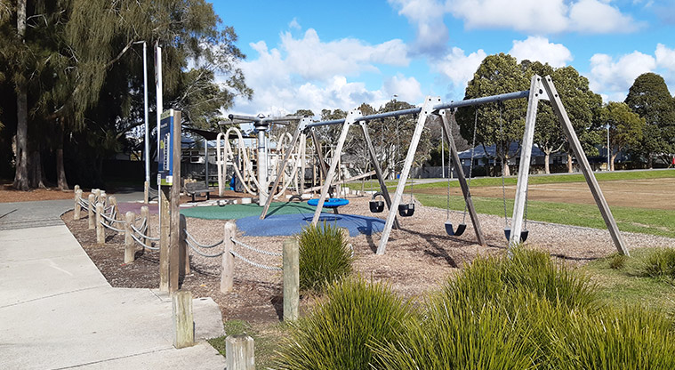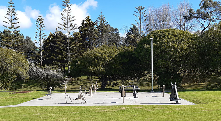 Toilets, a playground, a skate bowl, fitness equipment, parking, seating and picnic tables are inside this park.