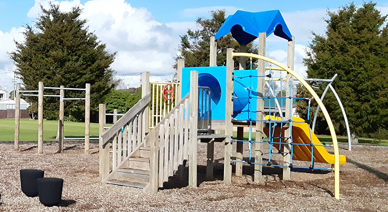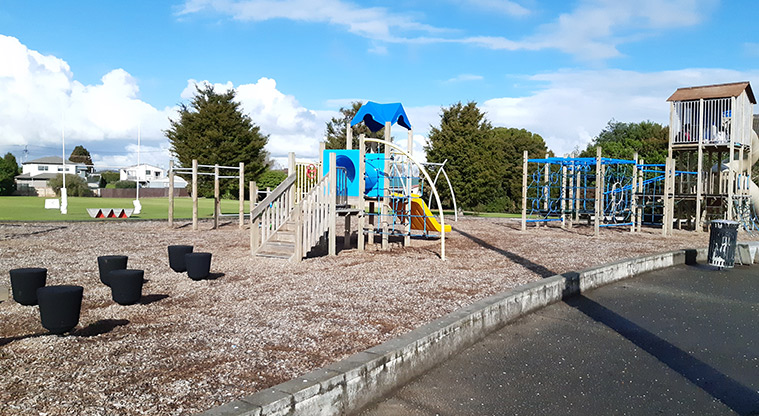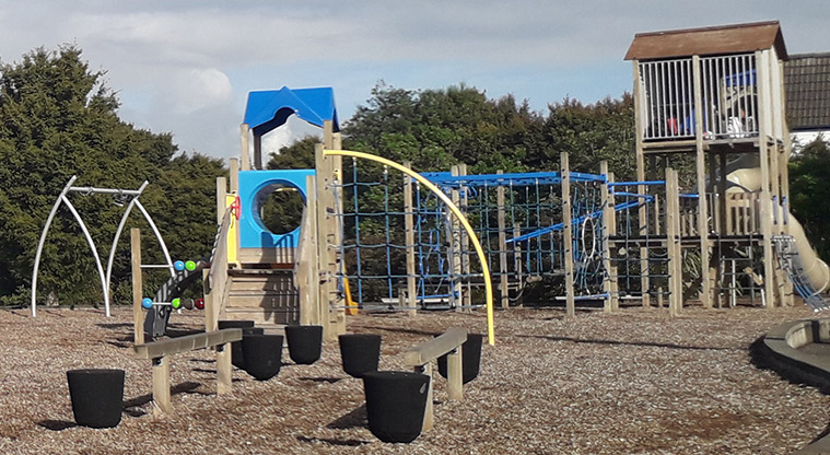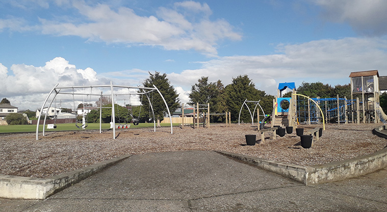 A playground, toilets, car park, picnic tables and seating, and sports fields are inside the park.