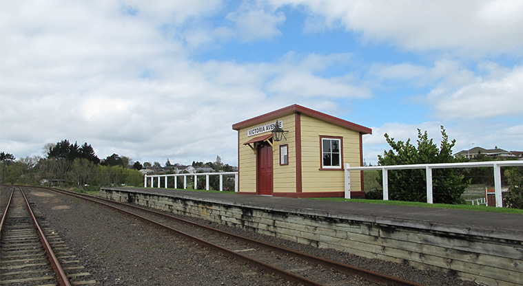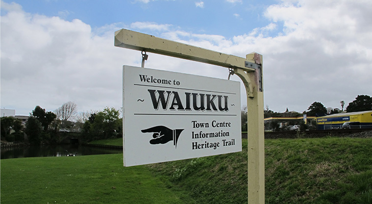 The path starts at the Welcome to Waiuku sign, by the Glenbrook Vintage Railway.