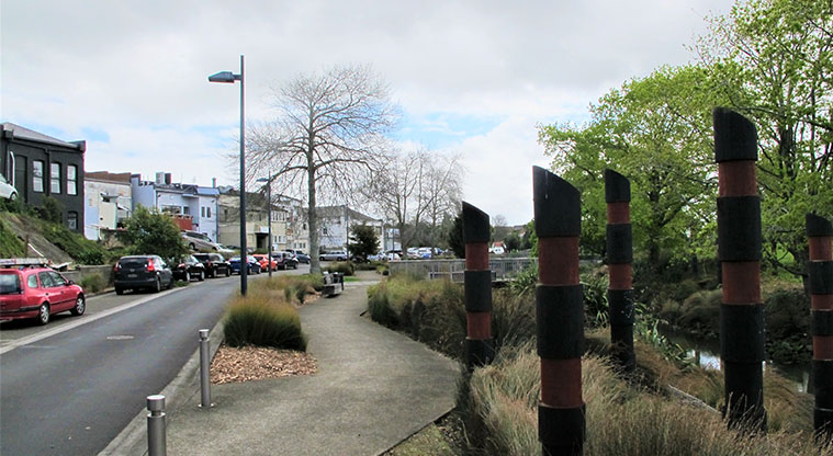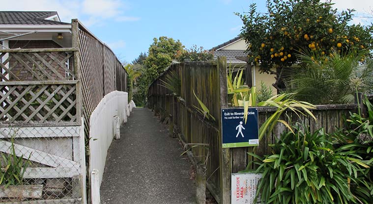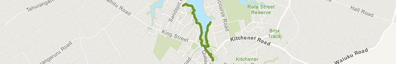 You will walk along the Waiuku Stream before heading up to Kitchener Road. Cross the road using the pedestrian crossing and get onto River Lane.