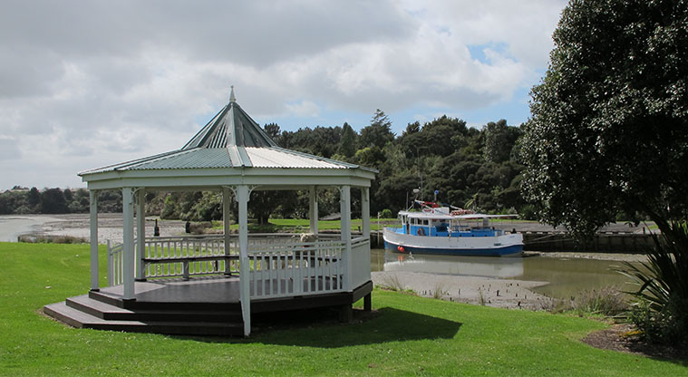 Grab some shade under the white gazebo that looks out across the Waiuku River.