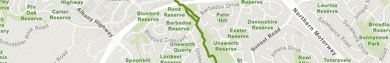 Park your vehicle in Azure Grove. Enter Unsworth Reserve at the intersection of Azure Grove and Goldfinch Rise. The path winds its way downhill, initially past an excellent playground, grass areas and exercise equipment before entering the bush on a wide, fully-fenced boardwalk.