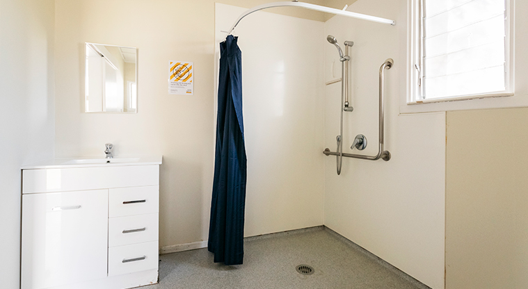 One bathroom with accessible toilet and shower, and an automatic washing machine.
