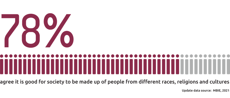 Most New Zealanders (78 per cent) agree it is good for society to be made up of people from different races, religions, and cultures. The majority recognise that migrants make an important contribution to New Zealand's culture, society and the economy.